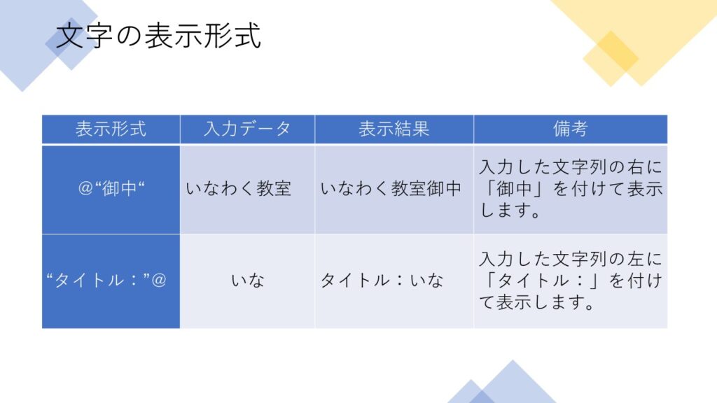 | 💡 @(アットマーク)の使い方 @は「入力した文字列そのもの」を表す記号です。たとえば書式を @”御中” にしておくと、「川島商事」と入力するだけで「川島商事御中」と自動表示されます。 |