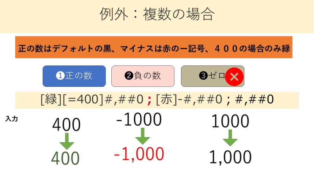 - セミコロンで「正・負・ゼロ・文字列」の4パターンを設定できる